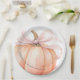 This elegant and charming baby shower paper plates feature a beautiful watercolor illustration of a pumpkin with a delicate pink ribbon, perfect for celebrating the upcoming arrival of a little one in the fall season.