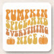 This delightful fall design captures the essence of the season with the phrase "Pumpkin Spice and Everything Nice" presented in a bold, retro-inspired font. The text is arranged in a playful, wavy layout that gives the design a dynamic and energetic feel. Each word is filled with warm autumnal hues, including shades of orange, yellow, and brown, which evoke the cosy and inviting atmosphere of fall. The design is further embellished with charming illustrations of pumpkins and a single autumn leaf, adding a touch of seasonal flair.