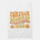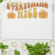 This delightful fall design captures the essence of the season with the phrase "Pumpkin Spice and Everything Nice" presented in a bold, retro-inspired font. The text is arranged in a playful, wavy layout that gives the design a dynamic and energetic feel. Each word is filled with warm autumnal hues, including shades of orange, yellow, and brown, which evoke the cosy and inviting atmosphere of fall. The design is further embellished with charming illustrations of pumpkins and a single autumn leaf, adding a touch of seasonal flair.
