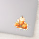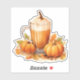 Design features a delicious looking pumpkin spice latte in a glass mug, surrounded by miniature pumpkins and fall leaves.