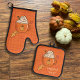 A cute orange plaid oven mitt and pot holder set for the fall season with the doodle of a pumpkin spice latter . Personalise it with your text or leave it as it is .