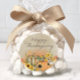 "Happy Thanksgiving" sticker with orange and white pumpkins, yellow sunflowers, and a rustic picket fence. Perfect for gift bags and envelope seals.