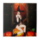 A bewitching red-haired sorceress sits atop a glowing jack-o'-lantern, framed by a gothic arched window and an eerie, enchanted forest backdrop. With glowing pumpkins at her feet and a mischievous look, she brings dark glamour to the Halloween night.