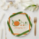 I love when it is time to work with fall colours! These plates feature a large orange pumpkin and green vines with leaves in the centre, and your text is below. The design is framed with fun orange and green stripes, like lattice on a pie. Please enjoy your event!