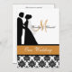 Black and white damask print with a pumpkin orange band, a silhouette bride and groom, and areas you can personalise with your names, monogram initial, wedding ceremony and reception information on a customised wedding invitation that's classy and traditional all in one!