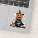 Add a touch of spooky charm to your collection with our pumpkin witch sticker. Featuring a pumpkin witch character wearing a classic witch hat, complete with a grin and holding her broomstick and standing behind her cauldron. This whimsical design is perfect for Halloween lovers, planners, laptops, water bottles, or anywhere that needs a sprinkle of spooky fun.