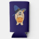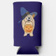 Whimsical cartoon dog in a wide wizard hat carries a glowing jack-o'-lantern. Bold lines, warm autumn colours, Halloween vibe, ideal for playful apparel and festive gifts.
