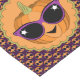 This fun Halloween table runner is decorated with a graphic design featuring an orange jack o’ lantern wearing cool purple cat style sunglasses from the era of the 1950’s.