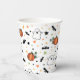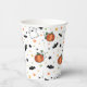 Cute Halloween themed paper cups for Halloween parties, Halloween themed baby showers, and Halloween birthday parties with a pattern of happy ghosts, pumpkins, bats, and stars.