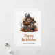 Halloween card featuring a haunted house, pumpkins and a skeleton ghost with a jack o’lantern. Easily personalise this watercolor Halloween card with your family name and text.
