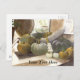 A watercolor painting of my sister's fabulous harvest, Thanksgiving display of several varieties of pumpkin, squash, gourds and garlic adorns this postcard!