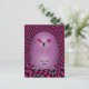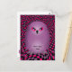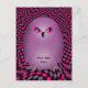 Cute punk owl in purple on a swirly chequerboard background in purple, hot pink, and black on a cute post card.