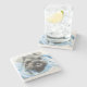 The coasters are gorgeous, a quality feel and heavy weight. They look like a precious archeological find. A rustic stone juxtaposed with a modern floral black and white print. I like the way the print goes slightly imperfect on the cut stone edges giving them a kind-of natural beauty.