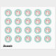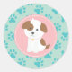 Puppy birthday party sticker with pink and mint and turquoise paw prints.