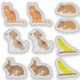 This cute animal sticker sheet designed by Destei features a collection of cute pet illustrations including a brown and white puppy, an orange cat, a yellow parakeet, a brown hamster and a brown rabbit. Each animal appears twice on the sheet, creating a set of stickers that highlight a variety of beloved pets.
