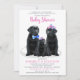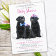 Invite your friends and family to celebrate the arrival of your new baby girl with this adorable black lab puppy baby shower invitations, party accessories and gifts . The sweetest black lab mum with flowers and dad with a bow tie, and a cute puppy baby girl with flowers adorn this invitation.
