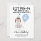 Cute puppy illustration birthday party invitation for your child's birthday! The white and brown dog is wearing a blue and white striped party hat and holding a blue balloon. Inside the balloon is an editable text where you can have the child's age printed. The text above says "Let's Pawty. it's gonna be a dog gone good time." At the bottom there are more customisable text to list the party information including the date and location.This funny party invite is definitely going to be a hit!