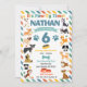 A cute puppy dog party invitation featuring loads of dog breads. Including, German Shepard, Huski, Jack Russel, Shiba Inu, Boston Terrier, Beagle, Bulldog and Pug.