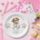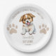 Puppy dog themed baby shower customised table decor personalised paper plates template, gender neutral brown colours with a cute border collie puppy baby shower monogrammed plates