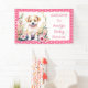 Cute puppy dog sitting in pink flowers personalised pink polka dot Welcome Baby Shower banner.
