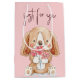 Watercolor puppy dog with pink flower on blush pink background with text.