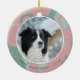 Puppy First Christmas Border Collie Dog Photo Ornament. Trendy white script on an abstract blush green and pink background. Custom photo in a round frame. Add your dog photo, name and year.
