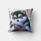 A playful, fluffy Alaskan Malamute puppy interacts with a red boot in a snowy winter scene. The charming setting includes a cosy cabin and snow-covered trees, evoking warmth and holiday cheer.