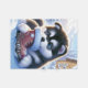 A playful, fluffy Alaskan Malamute puppy interacts with a red boot in a snowy winter scene. The charming setting includes a cosy cabin and snow-covered trees, evoking warmth and holiday cheer.