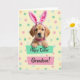Designed with a golden-furred puppy centered in the scene, this card shows bluish, soulful eyes looking straight ahead as if meeting a friend’s gaze. Oversized plush pink bunny-ear coverings sit on its head and are tied under the chin with a striped bow, adding a sweet 🐰 touch. A bright pink collar with a faint pattern frames its neck and gives the pup a dressed-up, affectionate look. The puppy’s front paws rest on a mint-green banner that runs across the lower middle, carrying a celebratory message in dark lettering. Just beneath it, a rosy-pink banner tilts at a similar angle and holds a shorter line of text in a lighter tone, creating a gentle layered effect. Behind everything, a soft yellow background glows with scattered pastel dots in pink, pale green, and light blue, like confetti drifting through spring air 🌷. Fine highlights pick up the texture of the fur around the cheeks and paws, while the banners cast small, tidy shadows on the yellow field. The mint-green strip sits slightly above the rosy-pink strip, both angled to the right against the dotted yellow backdrop.