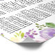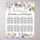 Purple and ivory white flowers create beautiful top and bottom borders on this 8-Table seating chart. There is lots of greenery and leaves and dangles. Please find your seat is written in a bold serif font. The wedding couple names are written in a beautiful script font.