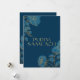 An elegant blue card with flowers for Purim gifting that says Purim Sameach.