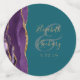 This elegant wedding table confetti design features the names of the bride and groom in gold-coloured handwriting script over a large ampersand on a teal blue background, bordered by a purple watercolor agate geode design trimmed with gold faux glitter. Easily replace the sample image on the reverse side with your favourite photo.