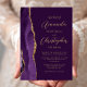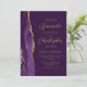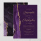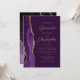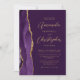 The left-hand edge of this elegant modern wedding invitation features a purple watercolor agate border trimmed with faux gold glitter. The customisable gold-coloured text combines script and sans serif fonts on a deep purple background. The reverse side features a matching purple and gold agate design.