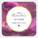 Kitchen stickers with an elegant abstract design. Dark purple amethyst colour with ribbons of gold nestled between layered strata. Rich and beautiful design. Layered over top is a white circle frame with a faux gold foil border, with your personalised text inside.