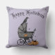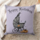 Hand-drawn in black ink, this gothic festive "Happy Halloween" throw pillow features hand-drawn illustrations in black ink by Nathalie Portet of an antique Victorian baby carriage, black crow, pumpkins and spiderwebs, all against an elegant purple background. With editable text, customise your pillow on the product page by clicking on "Personalise this template" before adding to your cart.