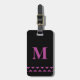 Personalise this luggage tag with your own initial on the front and your personal details on the back. Both sides have a black background colour with purple text. The front has a design of purple triangles in a row towards the bottom of the tag.
