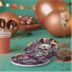 Día de Muertos or Halloween party paper plates in black, purple, gold with a sugar skull.