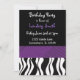 A black background accented by a border of white and black zebra print with a band of purple with a line pattern. Customise with all of your birthday information as desired.