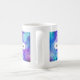 A mug with a cosmic abstract background. Swirling vibrant colours of light blue, pink and purple. White stars scattered around.
