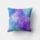 A pillow with a cosmic abstract background. Swirling vibrant colours of light blue, pink and purple. White stars scattered around.