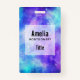 Name badge with a cosmic abstract background. Swirling vibrant colours of light blue, pink and purple. White stars scattered around.