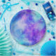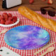 Paper plates with a cosmic abstract background. Swirling vibrant colours of light blue, pink and purple. White stars scattered around.