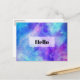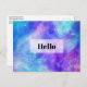 A postcard with a cosmic abstract background. Swirling vibrant colours of light blue, pink and purple. White stars scattered around.
