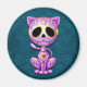This adorable purple kitten design is decorated with swirls and dot patterns. Yellow flower pedals circle the pure black eyes in the tradition of the Day of the Dead sugar skulls. The cat is sitting down, looking forward with its tail waving in the background. The oversized head sits on a tiny body which creates a playful, cartoon like appearance. A five point star sits in the middle of the kitten’s forehead while a bright red and yellow heart appears in the centre of the chest. A shadow falls onto the deep blue background making the design appear to float just above the surface of this magnet. This cute little cat is a fun and stylish design inspired by the beautiful patterns of Day of the Dead sugar skulls.