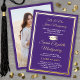 Share the joy of a high school or college graduation with elegant custom photo purple, white and gold foil announcements. (IMAGE PLACEMENT TIP: An easy way to center a picture exactly how you want is to crop it before uploading to the Zazzle website.) This formal style template includes parents' and graduate's names, as well as any wording of your choice, such as party invitation details, special honors, degree title, favorite inspirational quote, graduate's contact info, future education plans, or new job position. All text is simple to personalize. Front of design is printed with real metallic foil on a purple background. It features a gold border & mortar board cap, elegant script calligraphy, traditional typography, and one photo of your choice, such as a senior picture or image from the commencement ceremony. These graduation announcement cards are a modern and trendy way to share your special day celebration with family and friends. Congratulations to the graduate!