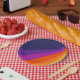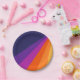 Abstract illustration of diagonal retro style stripes in purple, blue, orange and yellow colours on dark blue background