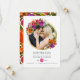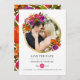 Purple and orange watercolor roses and peonies wedding save the date photo card with gold frame.