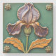 Art Nouveau ceramic tile with iris flower with purple petals and yellow leaves on a green background, surrounded by four small yellow flowers in the corners, vintage style.