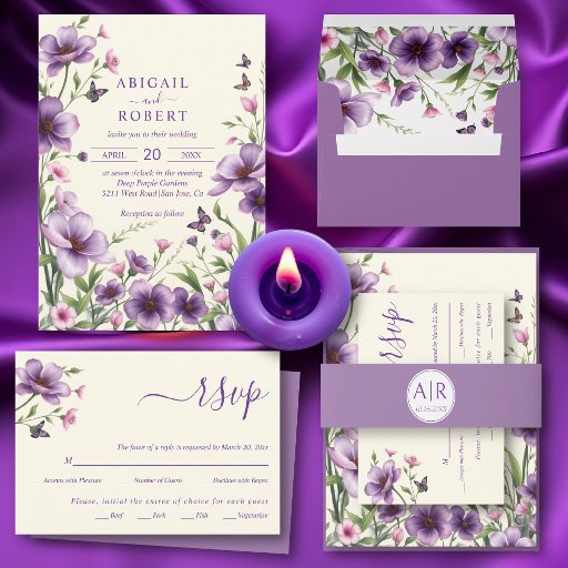 Purple and pink flowers wedding menu card