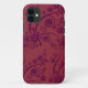 Purple and red iPhone 5 case with an embossed look floral pattern and swirls. A unique and pretty iPhone case with purple flowers and swirls a rich red background. The flowers and swirls have an embossed look and add a feminine touch to this sturdy iPhone 5 case.